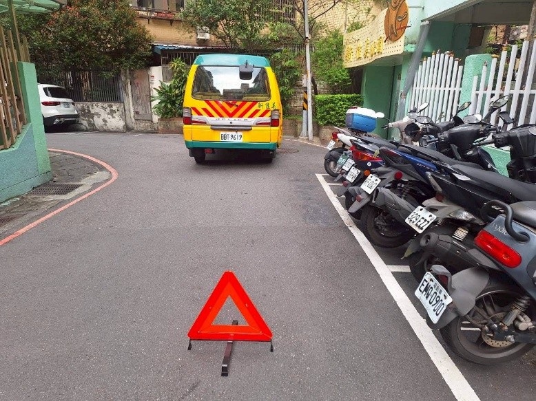 | 老師陪在幼兒身邊照顧與安撫情緒,清點人數,並確認每位幼兒的情形。 | 駕駛於幼童專用車後方設置警示標誌,以防止二次事故發生。 |