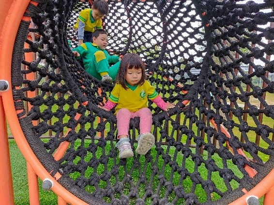 走在搖搖晃晃的木頭上有點兒害怕, 但我會小心的站穩每一步 | 在網狀隧道中前行, 好像沒有想像中的困難呢! |