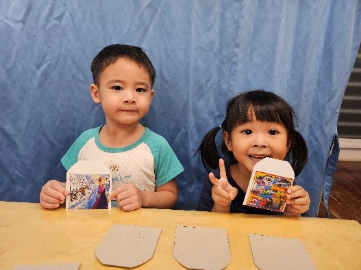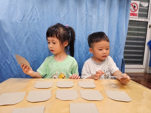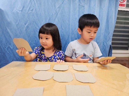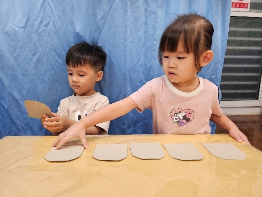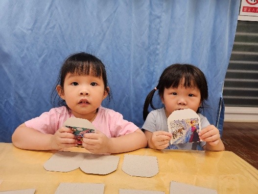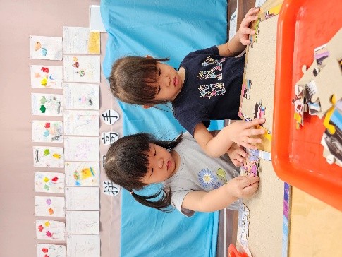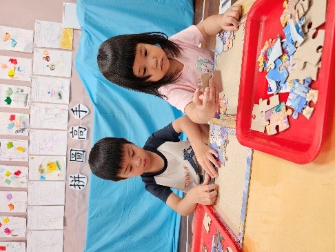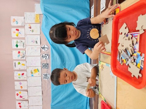 綿羊班的寶貝們,在「果凍拼圖」的角落內,嘗試挑戰不同圖案的拼圖,經過一段時間的玩索,漸漸地找到其中特別喜歡的圖案。大活動前,每位孩子先翻一張拼圖的圖案牌,接著就要來挑戰自己抽到的那片拼圖,可能剛好是自己熟悉地,能快速拼完成、可能是自己不熟悉的圖案,需要花一些時間來挑戰。小寶貝們很努力地試一試,每位都是厲害的「拼圖高手」。