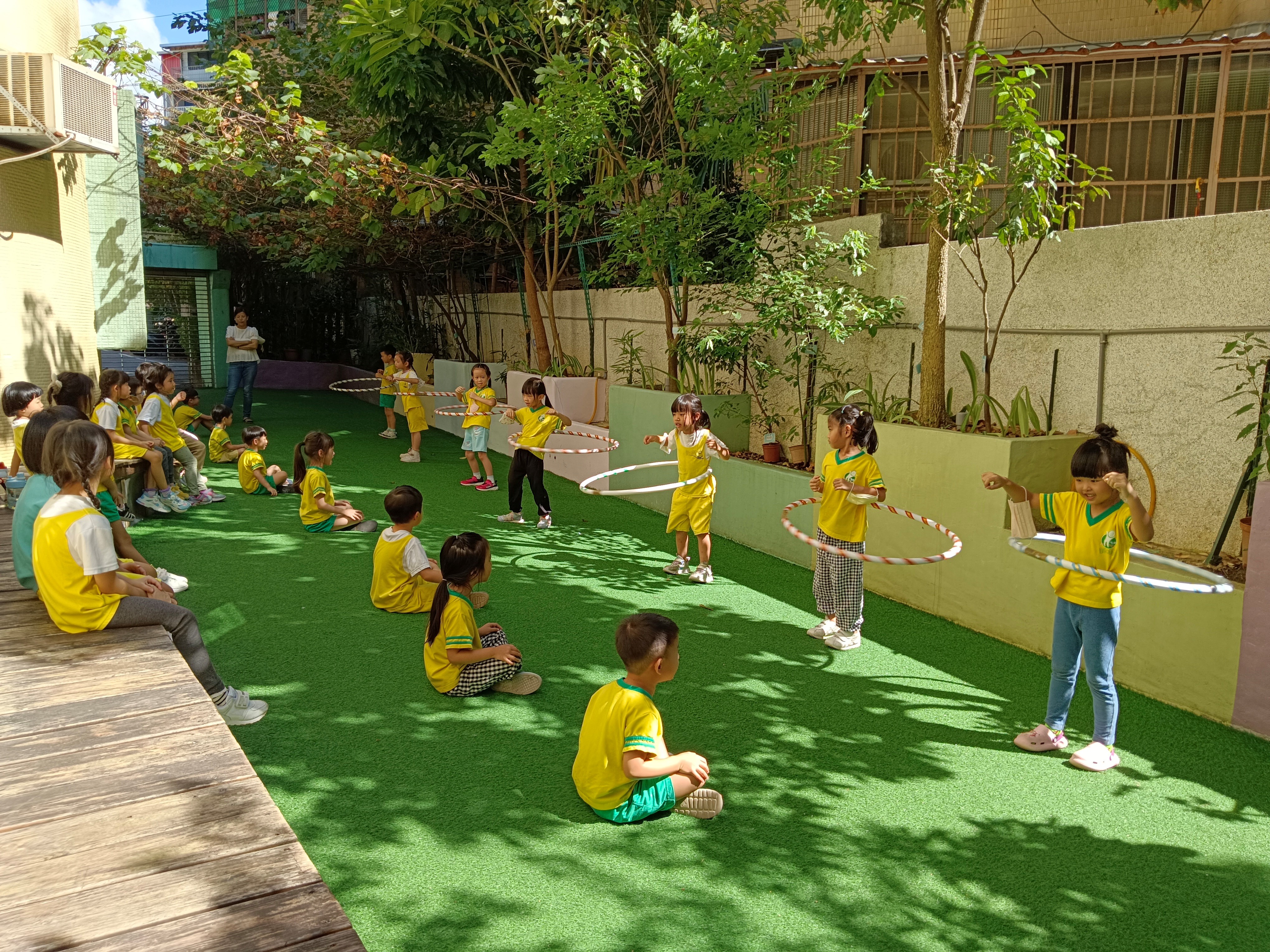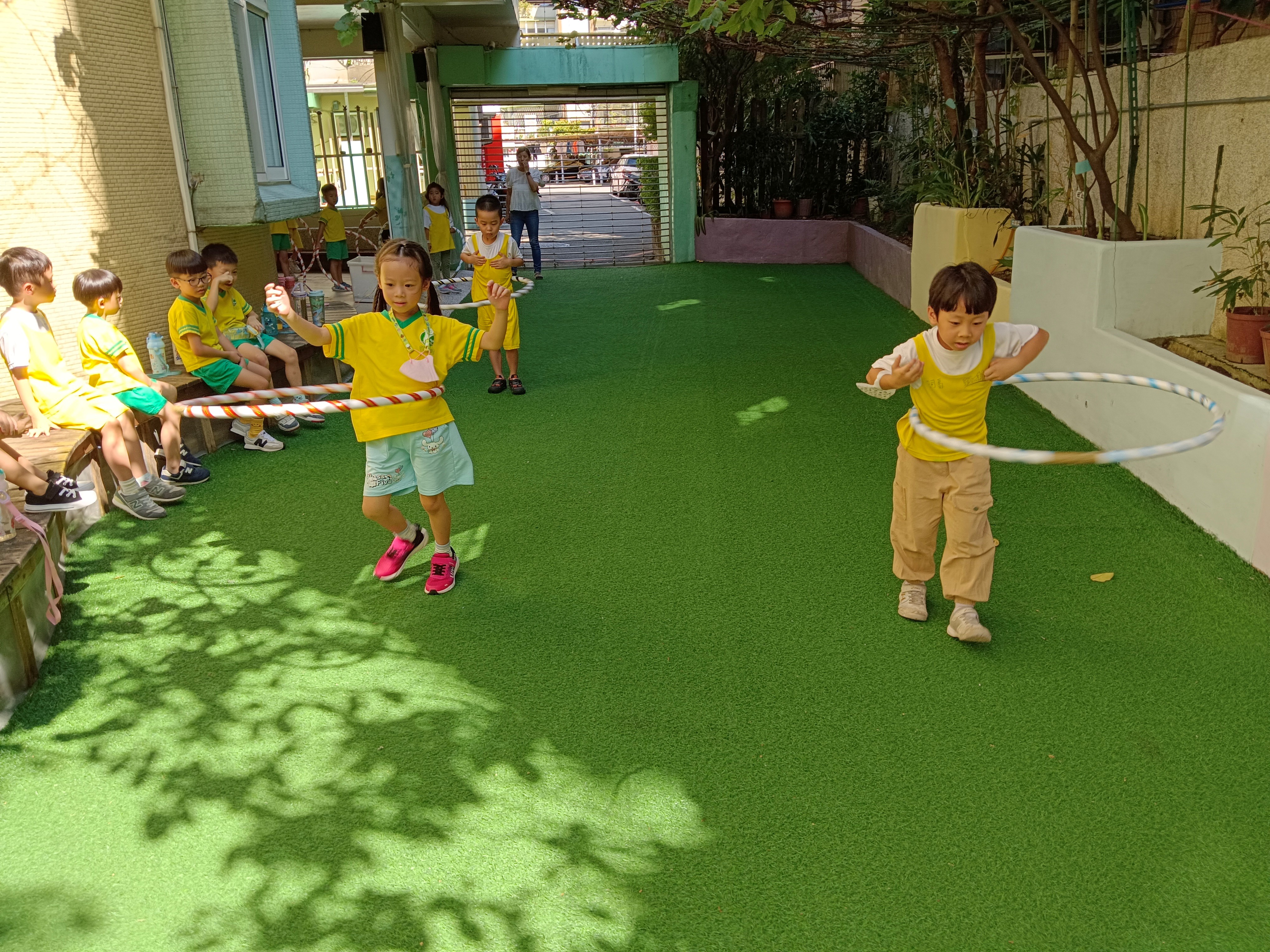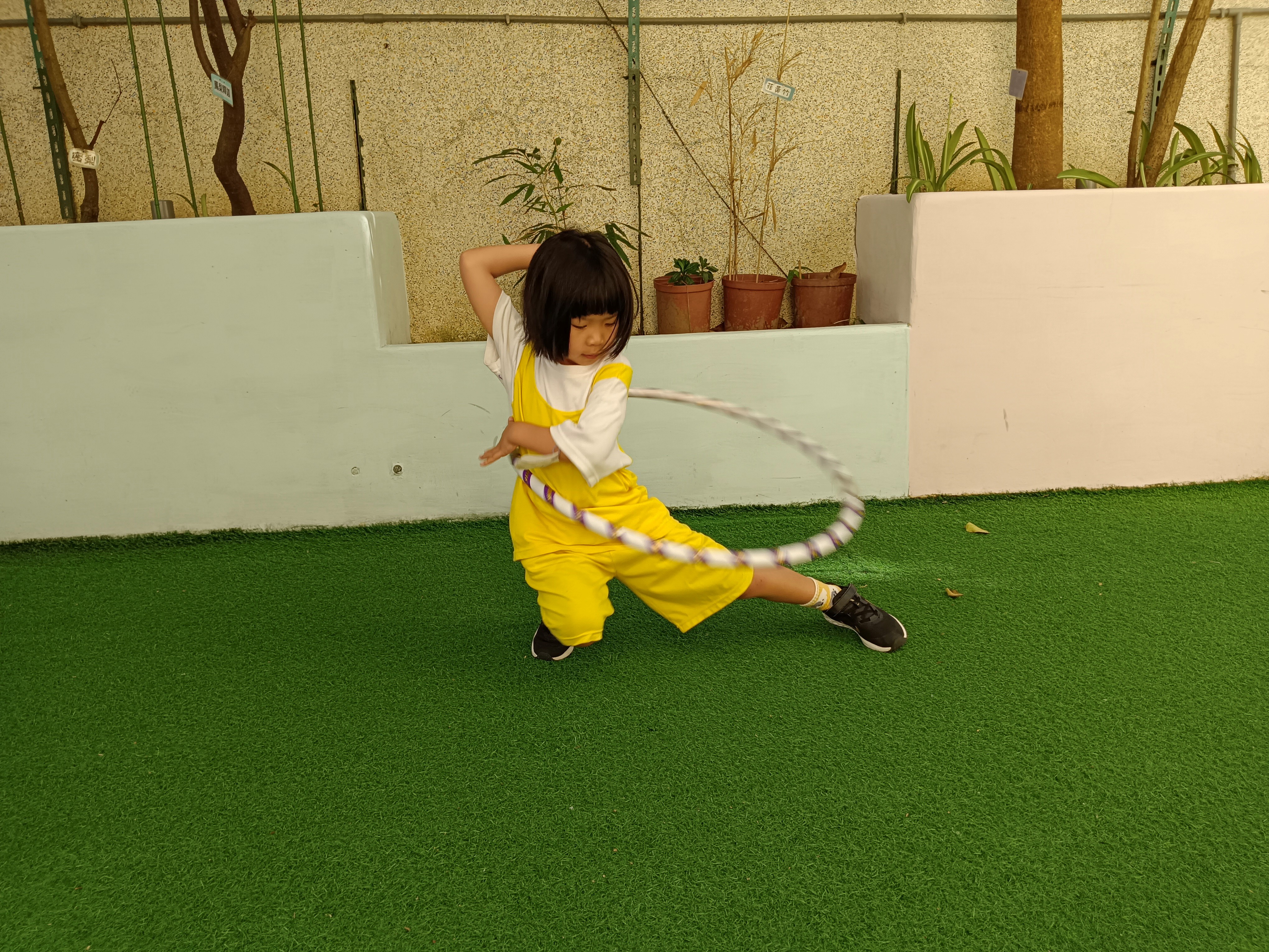 看誰的呼拉圈可以搖最多圈 | 我們可以邊走邊搖繞行草地一圈都不掉落喔! |