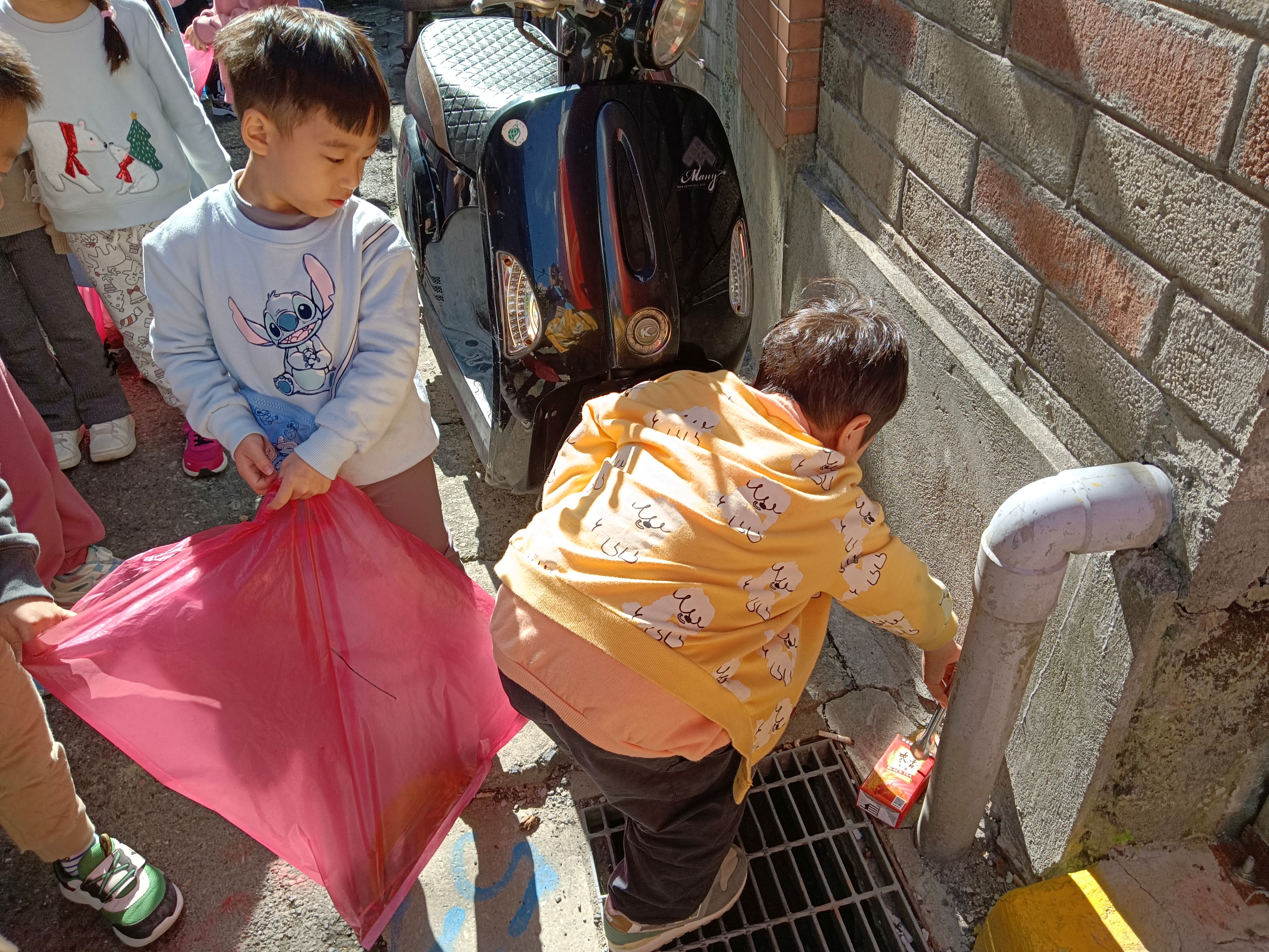 哇~我們這組的垃圾袋收穫不少喔! | 讓我們一起合作把垃圾袋綁緊 |