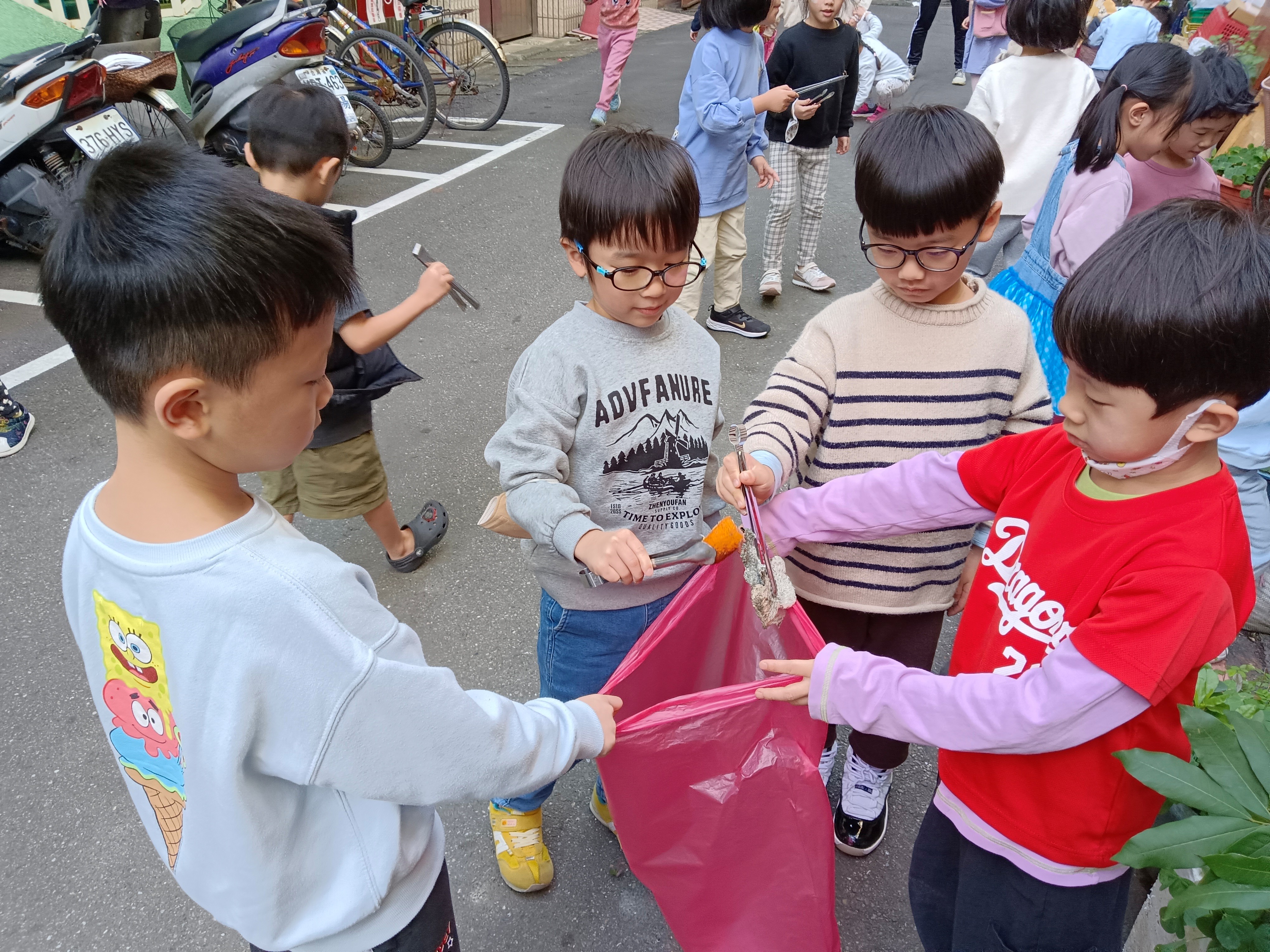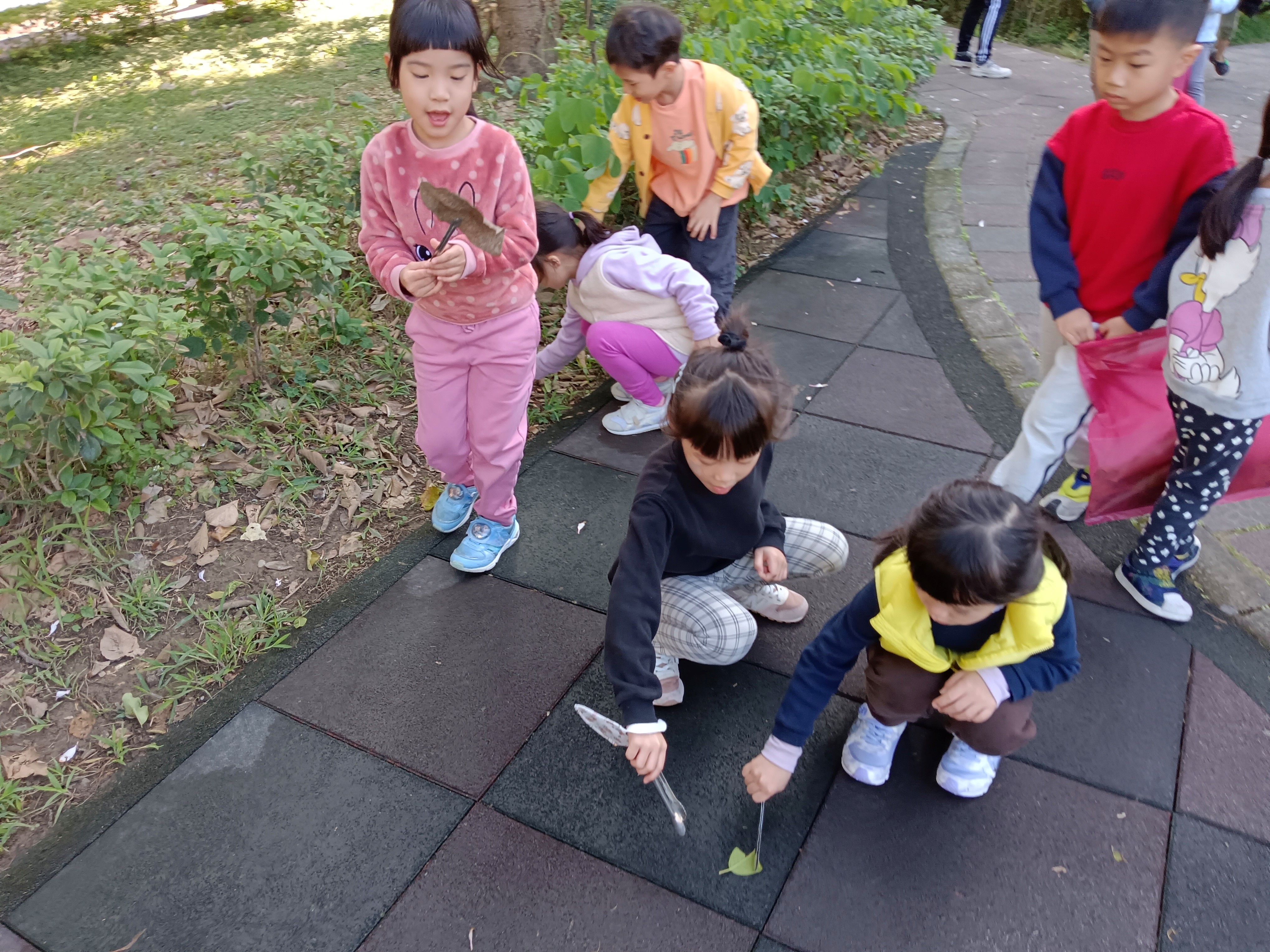 看誰可以夾起最多的落葉喔! | 大家分工合作把長長的落葉放入袋中 |