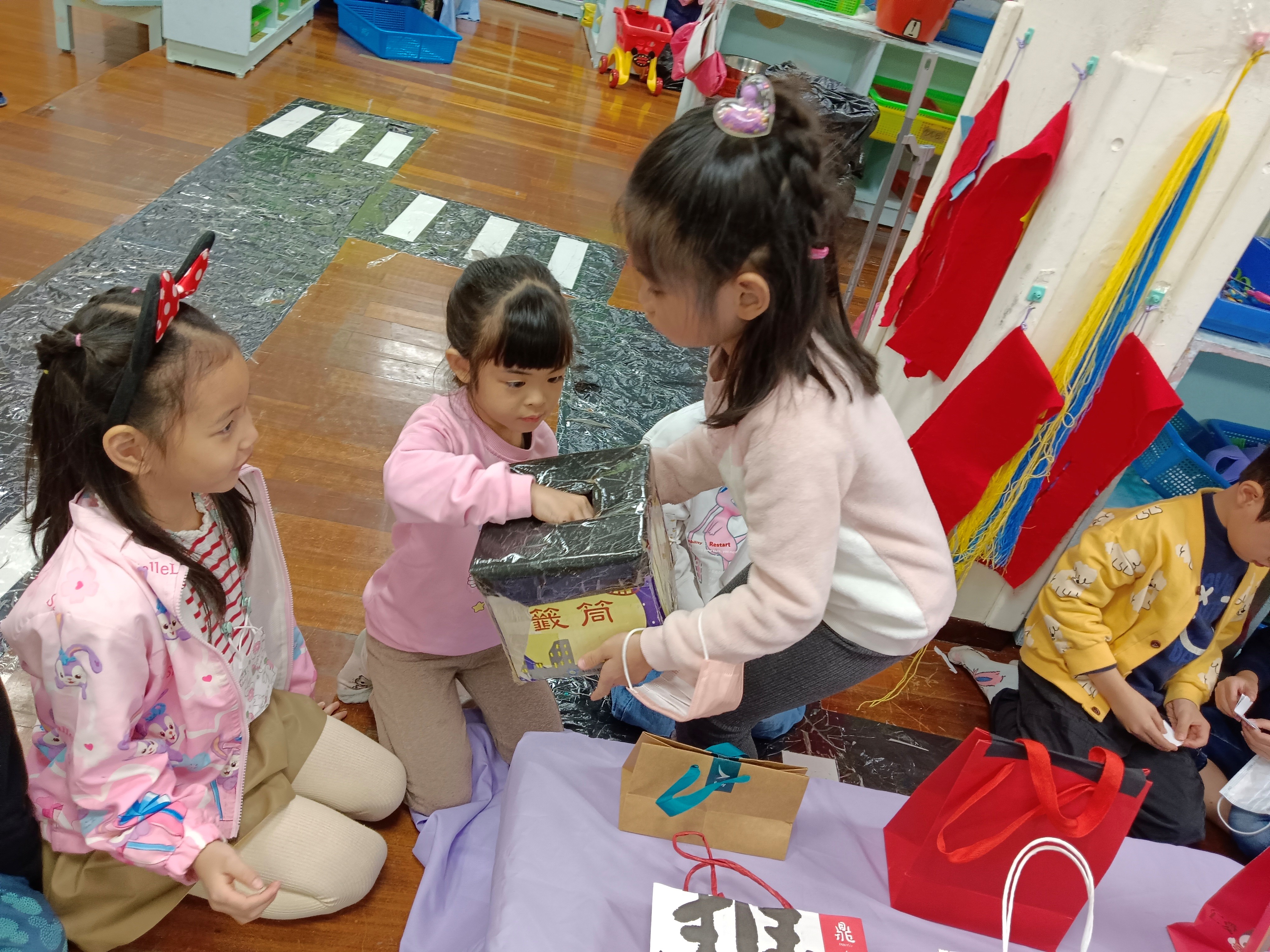 孩子會先找一位朋友,問問朋友想要的禮物是哪一種(有聖誕吊飾和聖誕不倒翁可以選擇),送禮的孩子就會精心設計他要送朋友的小禮物,並且在禮物的後面會有秘密的感謝話喔~~