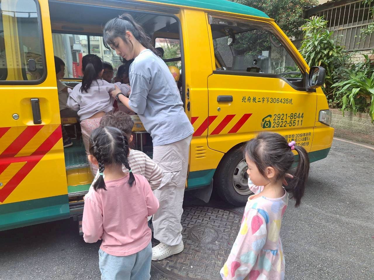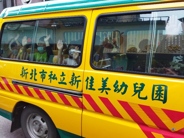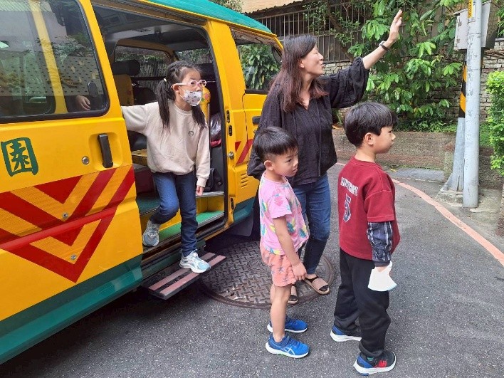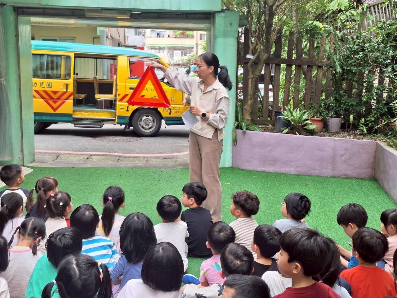 | 老師陪在幼兒身邊照顧與安撫情緒,清點人數,並確認每位幼兒的情形。 | 駕駛於幼童專用車後方設置警示標誌,以防止二次事故發生。 |