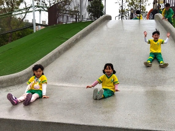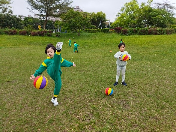 沙坑是我們的最愛,可以用沙子做蛋糕、 挖沙子隧道,也能讓沙子來玩溜滑梯呢。 | 我們從學校帶了小皮球來玩, 帥氣一踢!要接住我踢出去的球喔~~ |