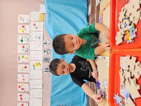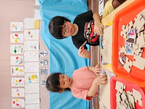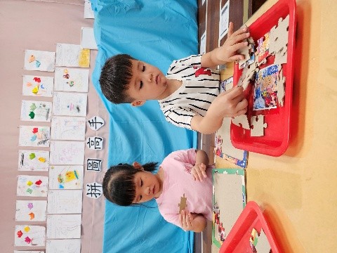 綿羊班的寶貝們,在「果凍拼圖」的角落內,嘗試挑戰不同圖案的拼圖,經過一段時間的玩索,漸漸地找到其中特別喜歡的圖案。大活動前,每位孩子先翻一張拼圖的圖案牌,接著就要來挑戰自己抽到的那片拼圖,可能剛好是自己熟悉地,能快速拼完成、可能是自己不熟悉的圖案,需要花一些時間來挑戰。小寶貝們很努力地試一試,每位都是厲害的「拼圖高手」。