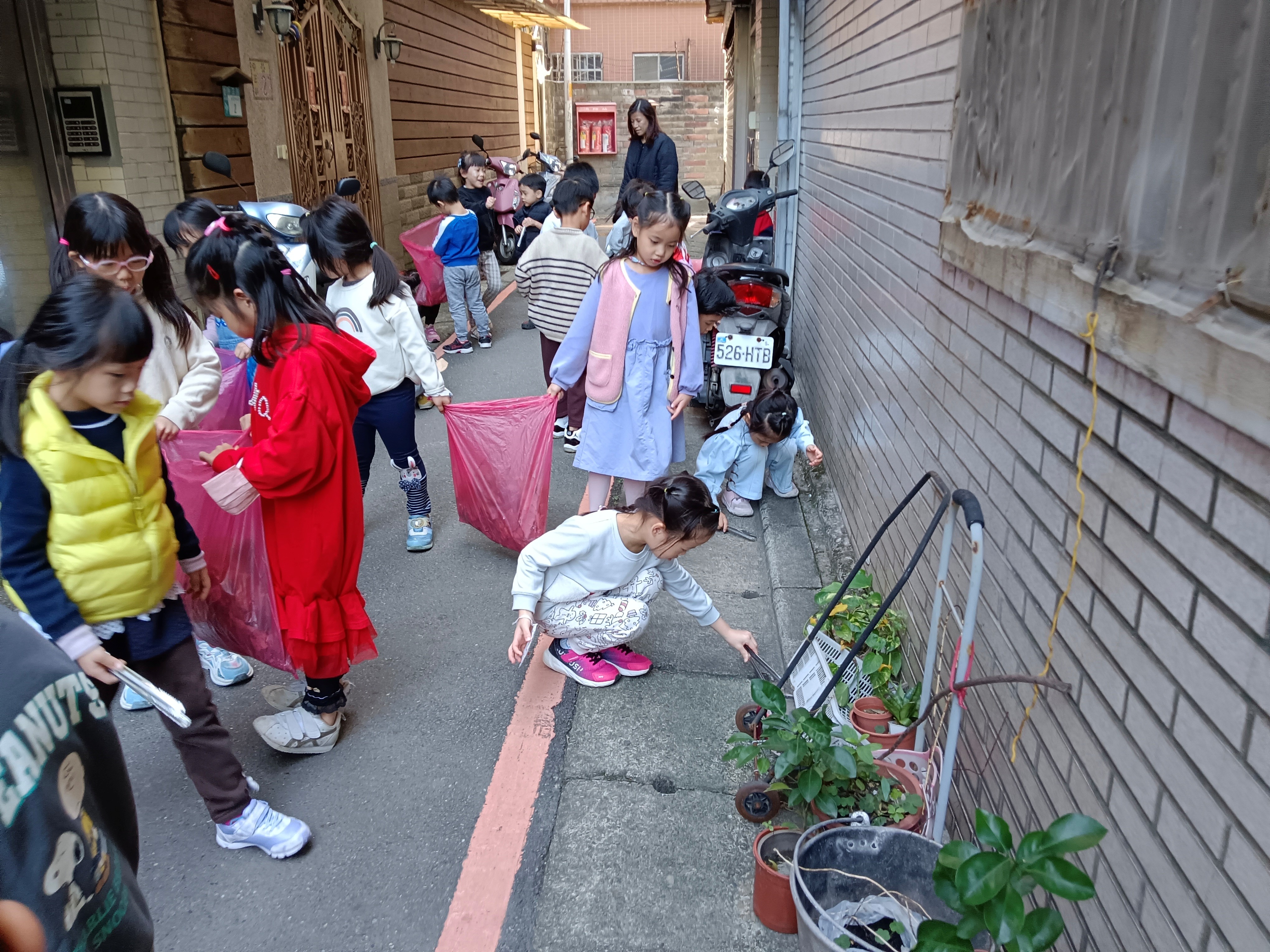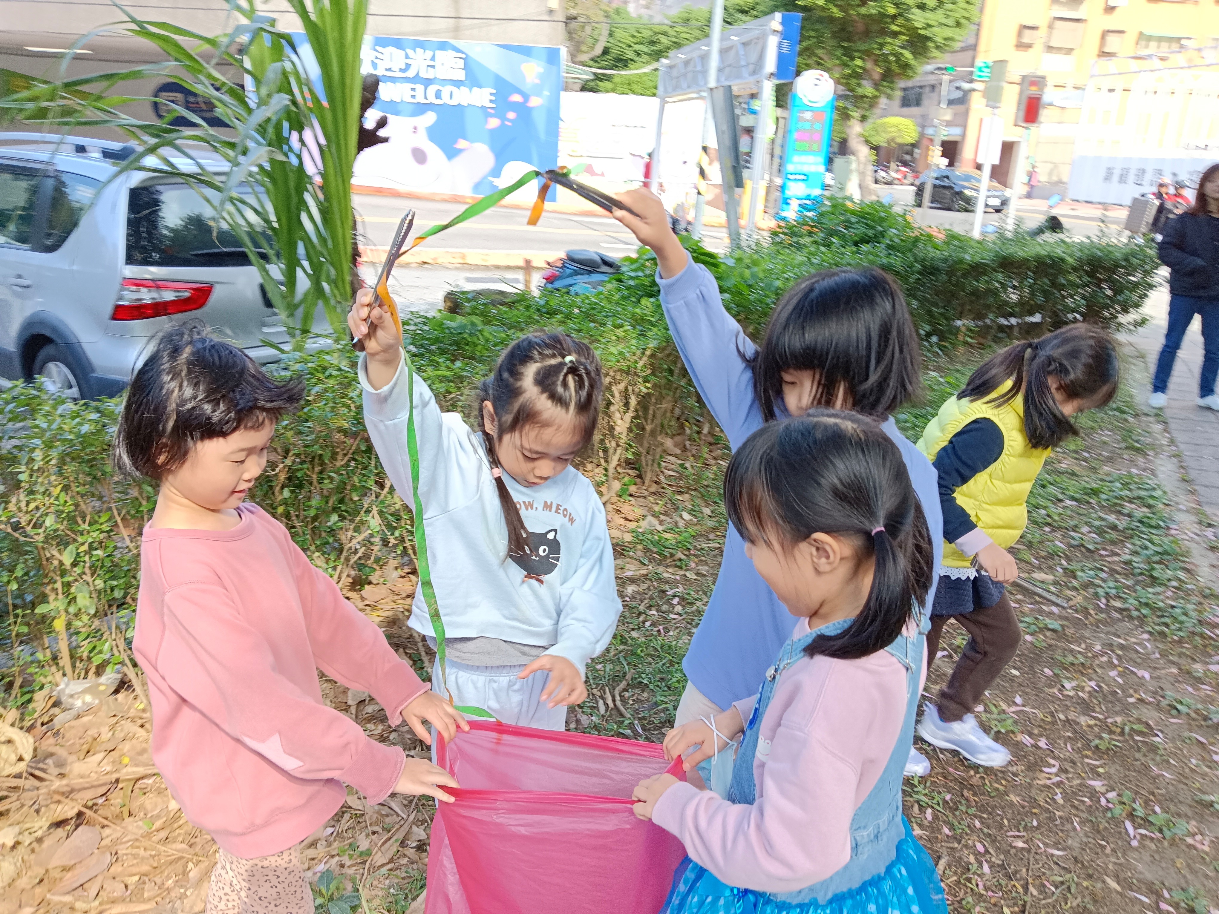 看誰可以夾起最多的落葉喔! | 大家分工合作把長長的落葉放入袋中 |