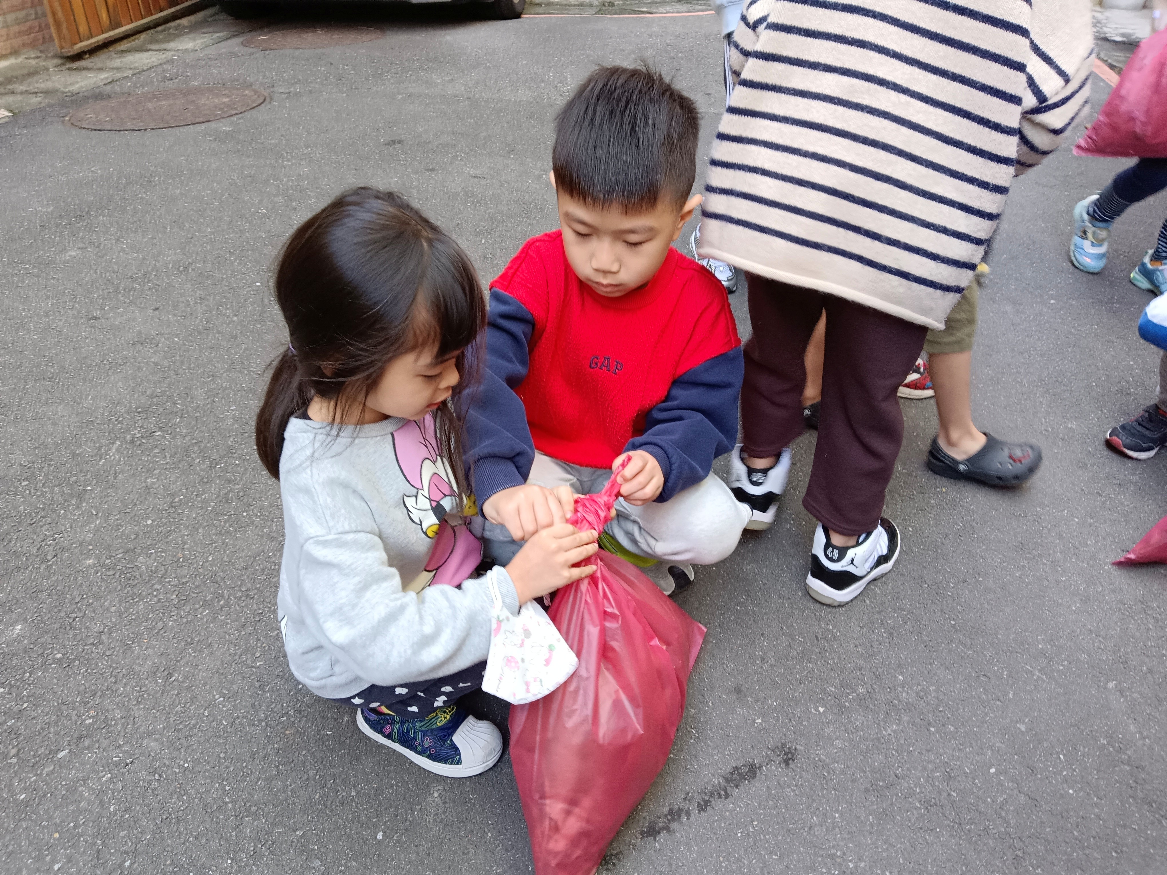 哇~我們這組的垃圾袋收穫不少喔! | 讓我們一起合作把垃圾袋綁緊 |